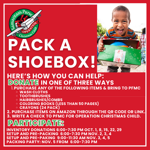 Each year, in cooperation with Operation Christmas Child, our church packs over 600 shoeboxes to send to children in 170 countries as a tangible demonstration of God’s love.