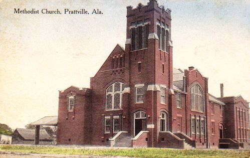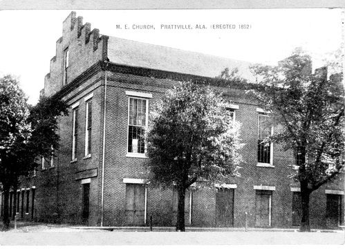 In 1843, before our present sanctuary was constructed, Methodists first met in a wooden building located at the south end of Chestnut Street, and moved in 1853 to a brick two-story building near the corner of Maple and Bridge Streets. Both of the buildings were built by Daniel Pratt. Church services were held upstairs, while stores were on the first floor. The sanctuary in the brick building could seat 700 people, and had frescos painted on the walls. In 1911 this site was transferred to the gin company, and the congregation voted to build on the corner of Fourth and Chestnut Streets.